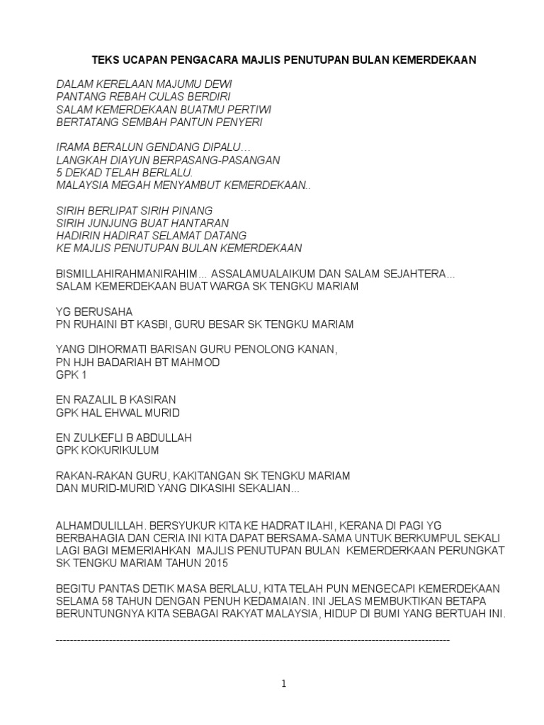 Teks ucapan pengacara majlis penutupan bulan kemerdekaan 2015. Secara ringkasnya program yang dari 1 5 April ini melibatkan 3 panitia bahasa iaitu Bahasa Melayu bahasa Inggeris dan Bahasa Arab. No files in this folder.