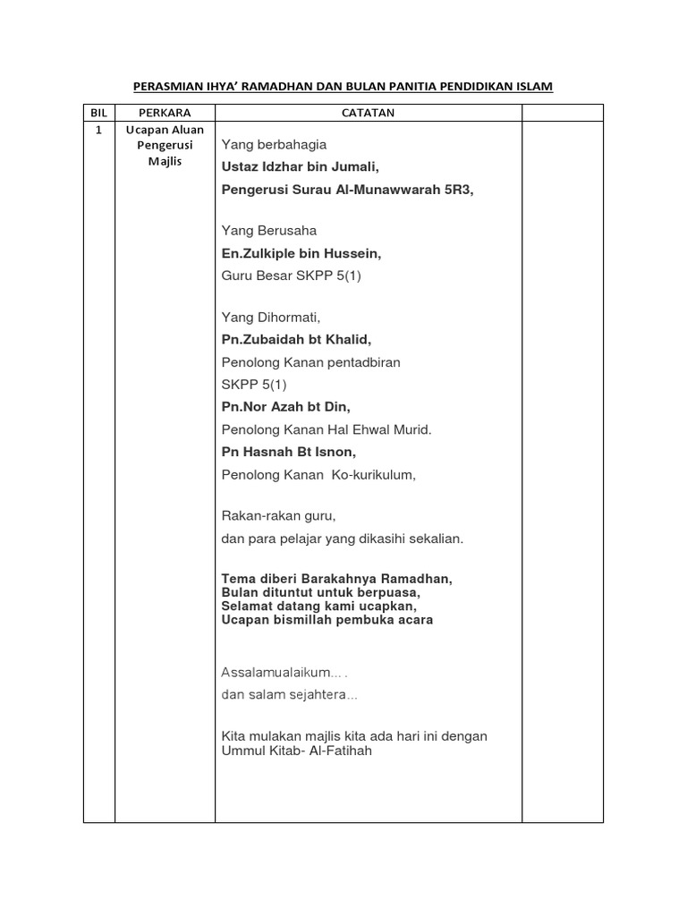 Norhairie Nordin Perkara Berkaitan Teks dan Ucapan Awal majlis Mengawal Audien Diminta semua hadirin mengambil tempat masing-masing sementara menantikan para tetamu jemputan dan penceramah tiba. Baiklah majlis di teruskan lagi dengan menjemput semua murid2 tahun 6. Doc Teks Ucapan Pengerusi Majlis Ceramah Agama Docx Dr Muhammad Nur Azimi Azizan Academia Edu.
