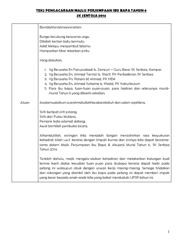Teks Pengacara Perjumpaan Ibubapa Thn 6