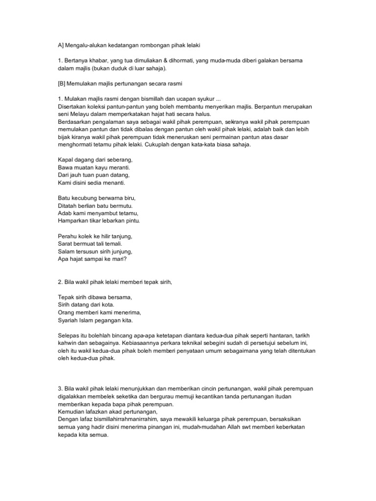 Tetak buluh kajang sepuluh Laksana dititing kias ibarat. 2 Bacaan Doa Majlis Dalam Bahasa Arab. Konsep pertunangan yang diamalkan oleh masyarakat Melayu hanya merupakan adat yang melengkapkan sesebuah institusi masyarakat.