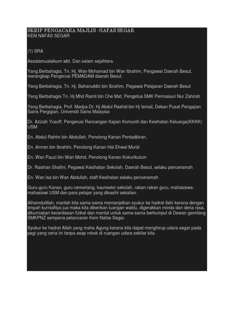 CONTOH TEKS PENGACARA MAJLIS JURUACARA MAJLIS. Assalamualaikum dan salam sejahtera. BISSMILLAHIRRAHMANIRAHIM ASSALAMUALAIKUMSALAM SEJAHTERADAN SALAM 1 MALAYSIA.