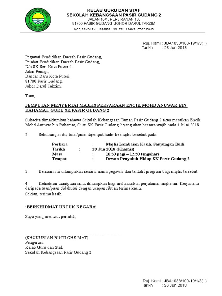 Perpisahan boleh menjadi sedih tapi jika anda perlu merancang majlis persaraan untuk rakan sekerja yang dikasihi biar Canva membantu anda membuat kad jemputan. Contoh Surat Jemputan Penceramah Melalui Guru Besar - Smkkd 01 02 008 05 1 2012 tarikh. The collection that comprising chosen picture and the best amongst others.