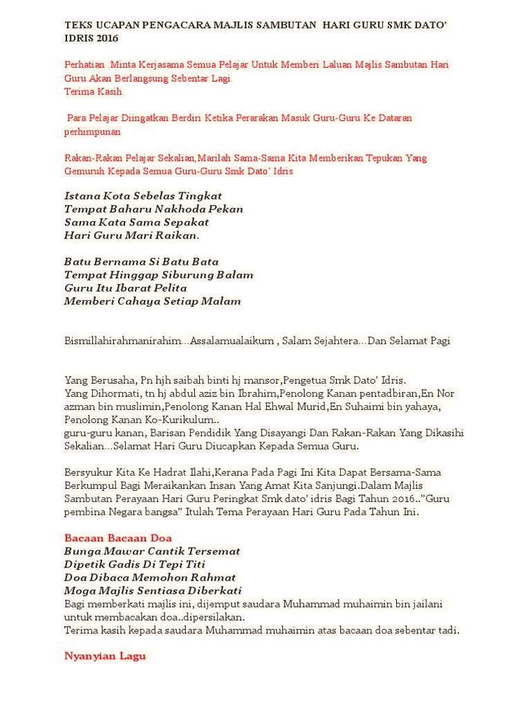 Teks pengacara majlis hari guru peringkat negeri. QUE TEKS CATATAN Makluman Dan Sila ambil perhatian. Assalamualaikum wbt salam sejahtera salam 1 Malaysia. Minta kerjasama semua murid untuk memberi laluan.